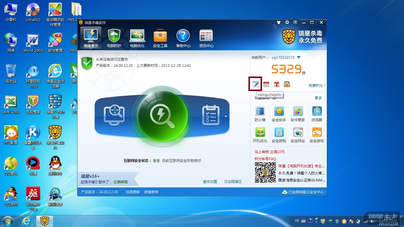 关于瑞星杀毒软件每日签到积分问题
