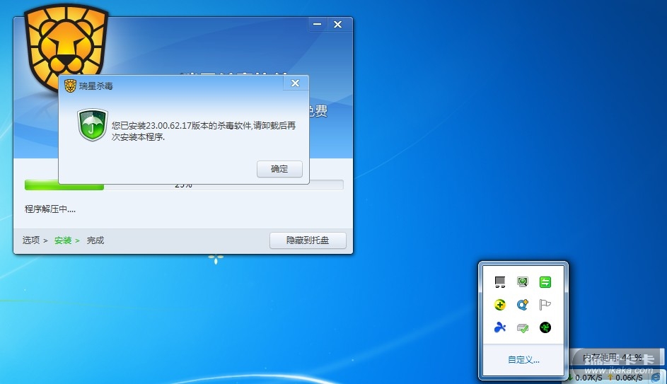 查找HKEY_LOCAL_MACHINE\SOFTWARE\rising\RAV看是否有这项,如果有,将其手动删除,再安装试试