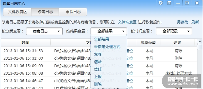 3、查杀结果能点击文件名、病毒名、操作列名进行排序,以方便用户快速检索到查杀失败的文件。