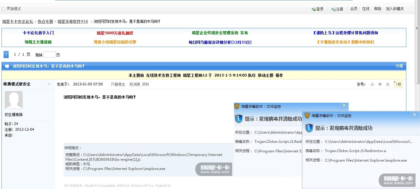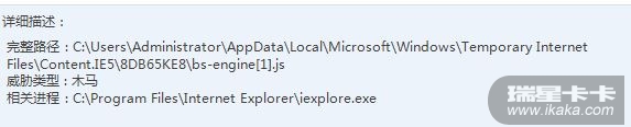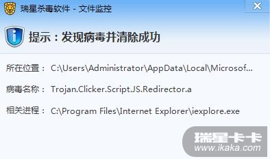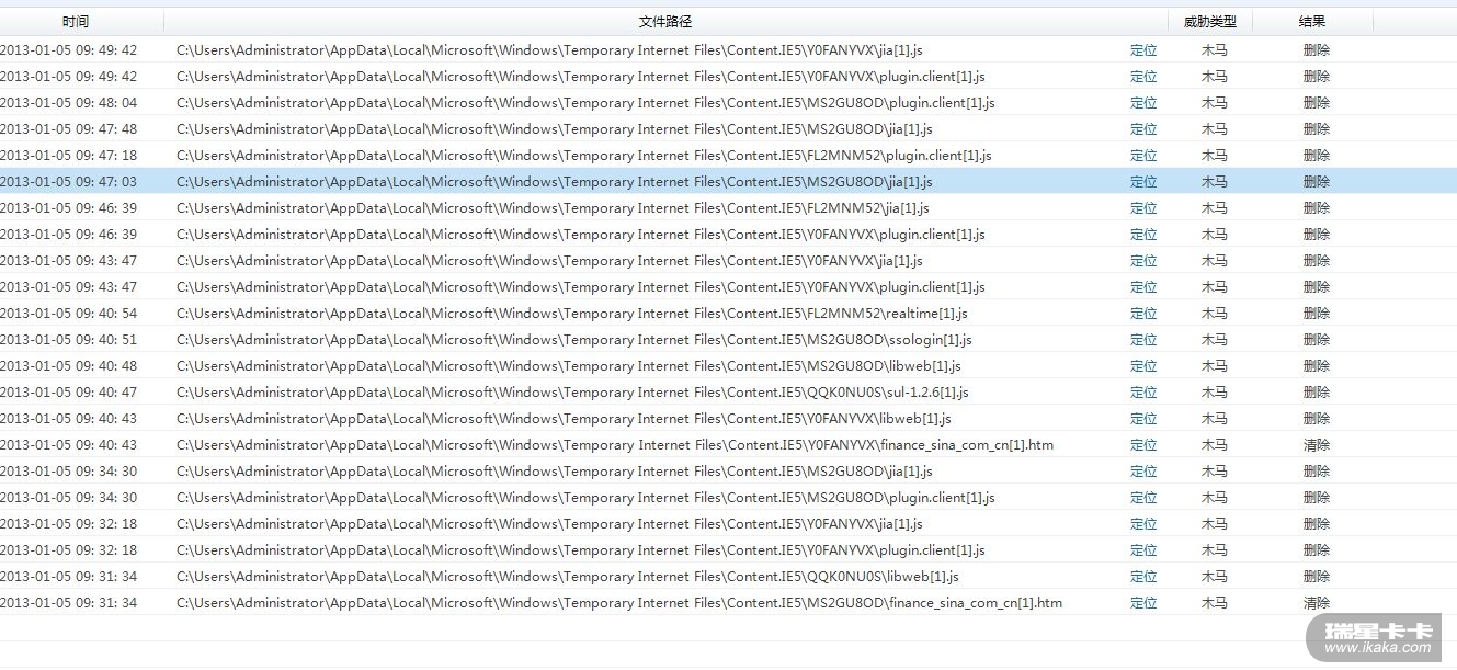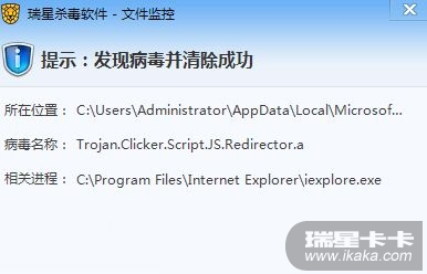 今天第一次查杀时,在瑞星文件夹也出现两个病毒,克隆恢复后又删了瑞星(忘了保存杀毒记录)、QQ,全部重新安装,一开网页上述木马提示又出来了。