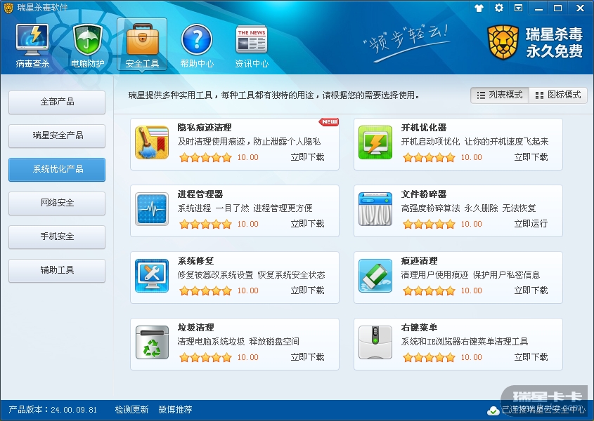 您好,瑞星杀毒软件V16和瑞星安全助手均有次功能。首先,打开瑞星杀毒软件V16,点击安全工具按钮,然后点击系统优化产品,下载开机优化器,运行即可,如图。