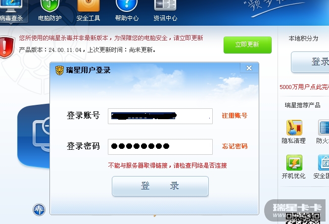 将瑞星安装目录下的rsd目录下的update.exe.log找到压缩发来。