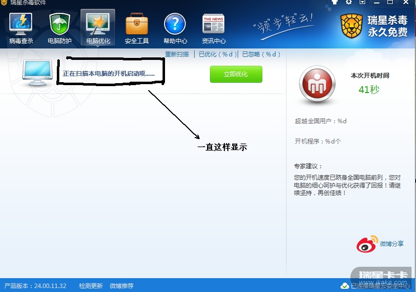 打开瑞星V16最新版的 电脑优化 选项 一直不能使用 ,点击无反应: