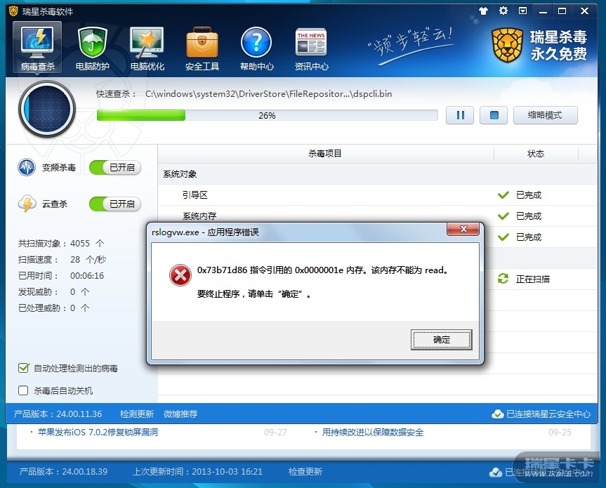 在使用瑞星的时候,出现了以下问题,我怀疑是瑞星出了错。