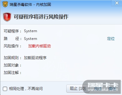 然后再说BUG,正如上图所示,瑞星将攻击源识别错误!我打开XueTr,瑞星却提示“System”加载内核驱动,而不是XueTr,说明攻击源不能正确识别,而且这个问题已经出现很多次,望改进。