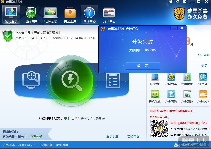 操作系统WIN7旗舰版,瑞星防火墙升级正常。