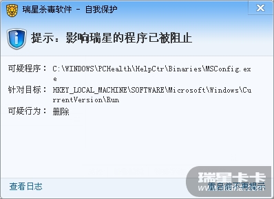 CAO,瑞星就是流氓软件,自动安装,卸载不了,关不了启动,不知不觉安装上了,想卸载,怎么都不行,关闭自动启动直接把MSCONFIG拦截了。流氓。