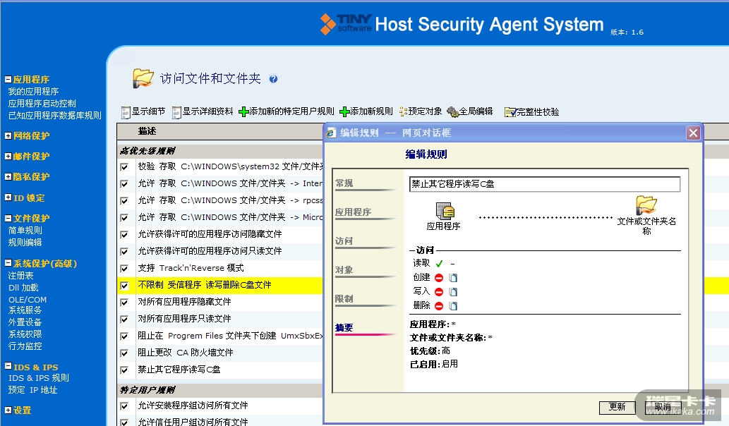 我在CAHIPS 中对C盘的读写删操作设置了如下限制(图1)。V16的 rsconfig.exe并未放到受信组中,因此,点击V16的“病毒查杀设置”时肯定会遇到问题。