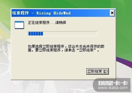 系统:XP SP2 IE版本:8.0 24.00.06.70 问题及现象描述: 关机的时候,有一定概率提示: 正在结束程序:Rising HideWnd 然后进度条满了之后,需要用户手动点击立即结束 是否必现:偶尔! 至今出现了两次了  用户系统信息:Mozilla/4.0 (compatible; MSIE 8.0; Windows NT 5.1; Trident/4.0; .NET CLR 2.0.50727)