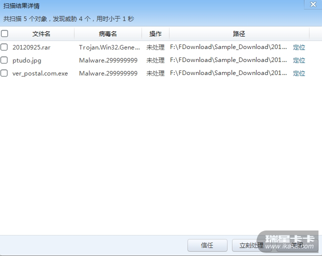 测试了几次,病毒名都没有复现图1的情况,且附件中的20120925.rar、ptudo.jpg、ver_postal.com.exe 这三个样本都报毒了