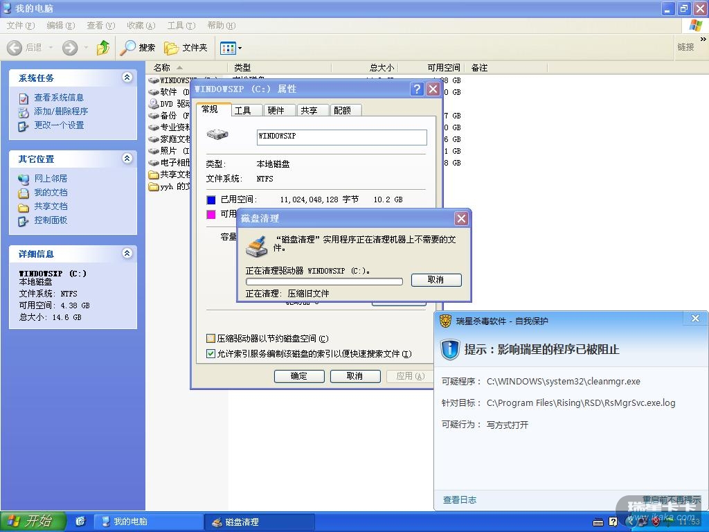 我在进行“磁盘清理”时出现下图的提示,而且磁盘清理变得非常慢。我以前安装的瑞星