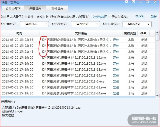 右键查杀显示发现并处理0个威胁,可是日志显示查杀了一个木马!为此我进行了三此验证!右键查杀界面有查杀的文件数,可是最后显示的界面没有!
