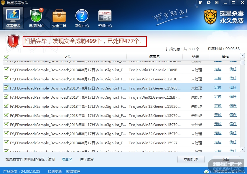 大致步骤是不勾选自动处理的选项的情况下扫描大量病毒样本,然后在扫描过程中在扫描界面勾选自动处理选项,扫描完成后星星并不会自动处理所有样本,会遗留部分未处理样本,此问题不一定毕现,但是平时测试时偶尔会出现这个问题。
