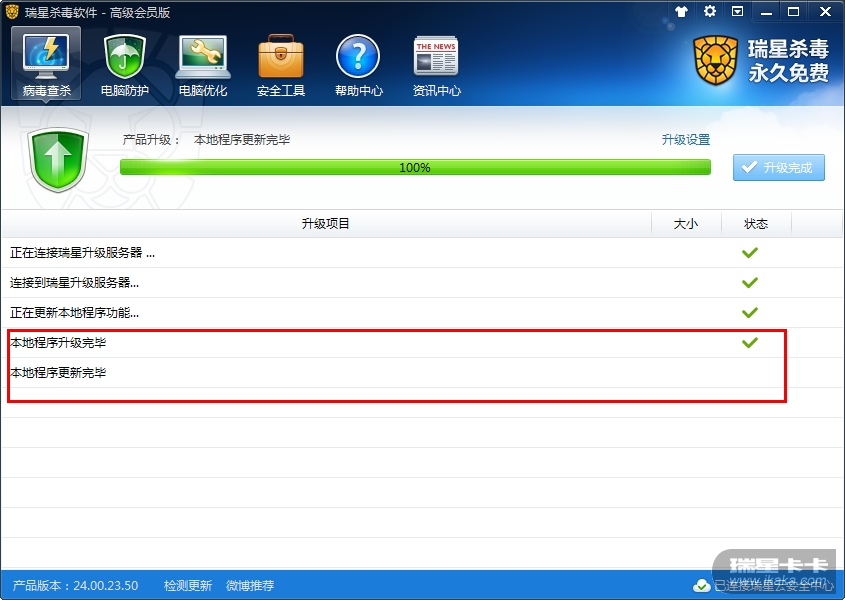 另,第一行“正在连接瑞星升级服务器”与第二行“连接到瑞星升级服务器”建议取其一,