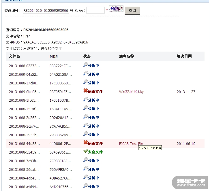 将扫描剩余的文件提交到病毒上报系统,上报系统显示其中部分文判定为病毒,并且早在2年前或者1个多月前已经入库处理
