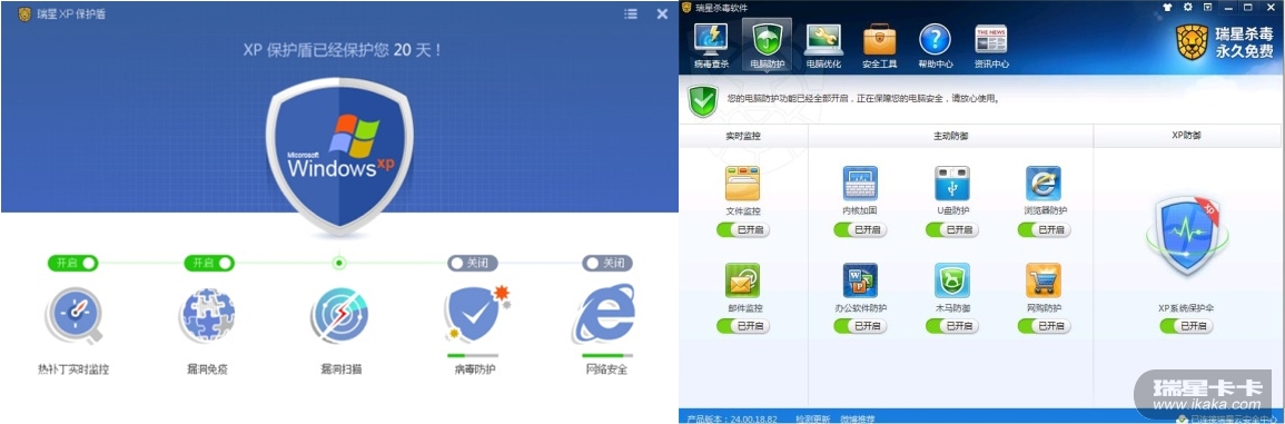 为保证XP用户的系统安全,瑞星推出了永久免费的漏洞防护方案及XP护盾工具,全体用户均可在第一时间得到专业的安全防护。广大XP系统用户只需将瑞星杀毒软件升级至最新版本便可开启XP系统保护伞功能,或访问瑞星官网下载瑞星XP护盾。
