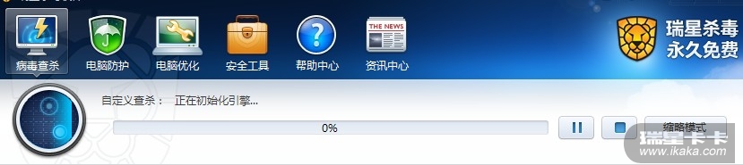 然后自定义查杀跟全盘查杀 就一直卡在 0% 不动 显示也只停在 正在初始化引擎 不管等多久都是这样。。然后按停止键也没有用。。