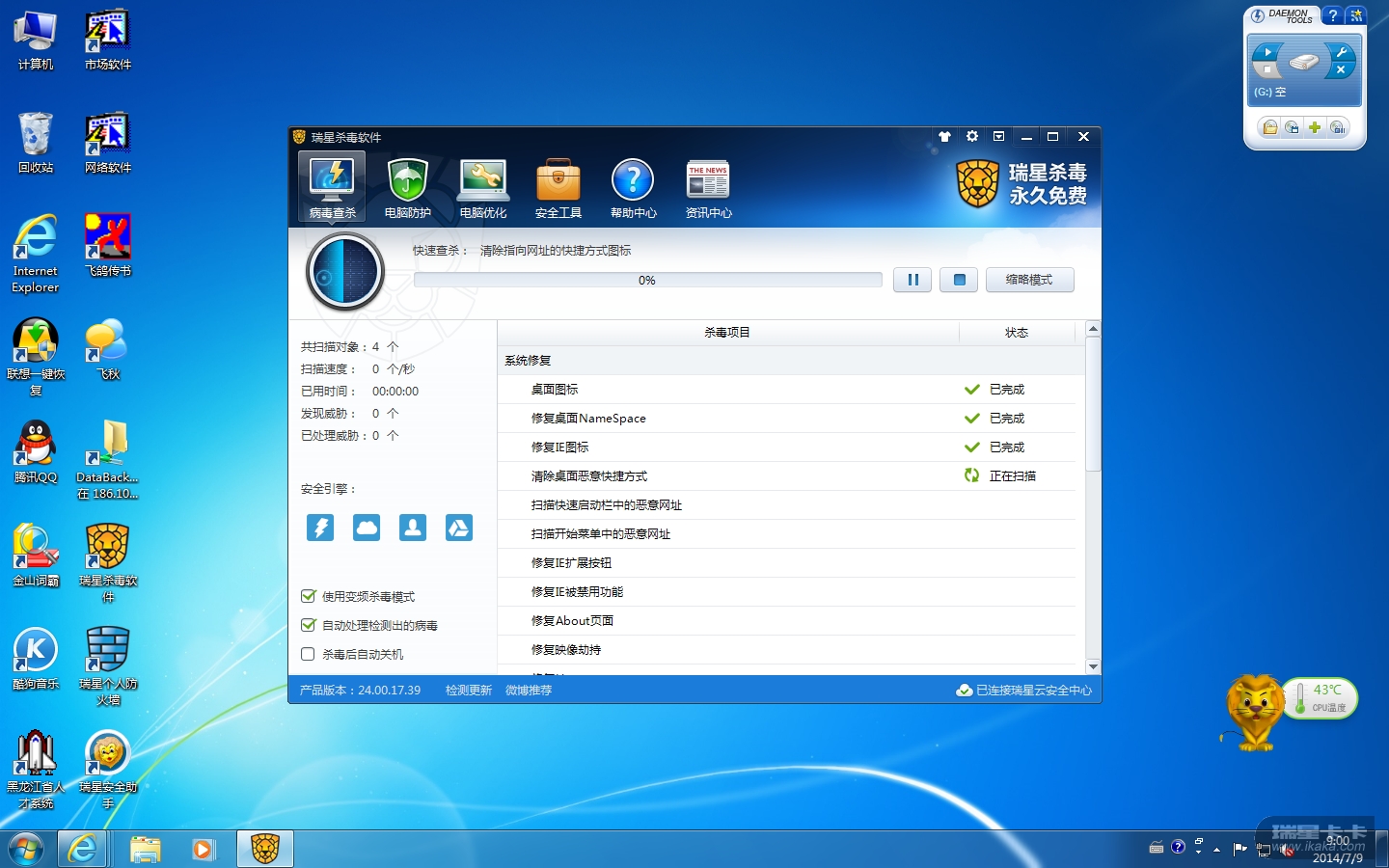 我的桌面上有一个连接局域网服务器共享文件夹的快捷方式,当电脑连接在非局域网环境的网络时执行快速扫描,有时会卡死在“清除指定网站的快捷方式”上。卡半小时都不往下扫描,这时候除非断网才会往下扫描。但也有的时候一切正常,不断网也能正常扫描。