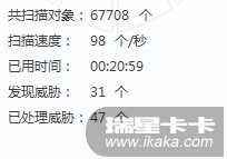 发现威胁比已处理威胁还要少,原因是没有点击自动处理检测出的病毒,第一次先手动选择一部分,然后点击立即处理,第二次全部选择,又点击立即处理,然后会发现第一次选择的已经处理过的文件又重新处理的一遍,已处理威胁又二次计算。