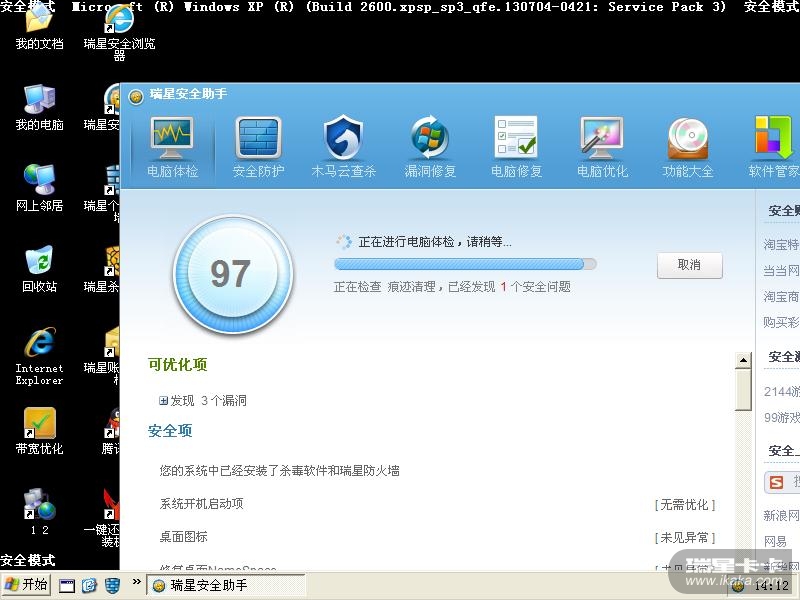 最近一段时间,我的卡卡不能正常给电脑体检了,即便在安全模式下,体检过程也总是停顿在最后快完成的那一点时间上(如图),记得很久以前曾有病毒藏身于卡卡中,杀毒时一直未被软件发现,有一次杀毒时偶然启动了卡卡,才被瑞星杀毒软件发现清除,这次不知又被什么流氓程序捣了鬼,多次卸载重装,都只能用一两次,不知如何是好,