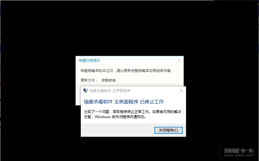 2、反复右键点击系统托盘区的“快速查杀”会不停弹出病毒库过旧,是否升级的提示,把第一个提示框关闭后,即进入快速查杀状态,但是其他提示窗口却无法关闭了,最后导致主程序报错。建议执行自定义查杀任务的时候,只允许一个升级提示实例运行。