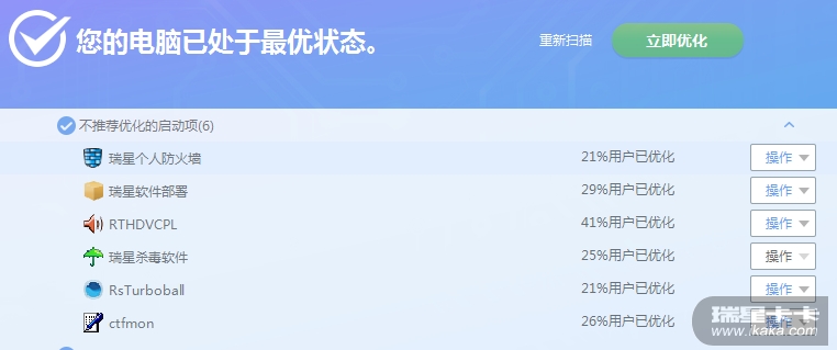 瑞星的开机优化还需增强,首先能不能把其中一些软件的启动项或是服务项等用中文显示出来,要不然很多小白用户看不懂,不方便自定义禁止启动项服务项计划任务项,举个例子,声卡驱动和瑞星加速球就不能显示中文吗,