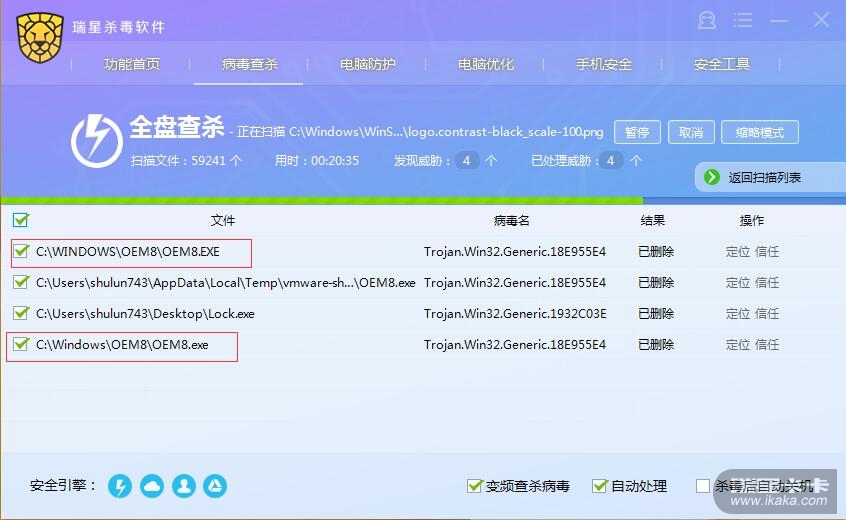 查杀结果中显示两个oem8.exe是正常的,一个是通过进程枚举到的,另一个是磁盘文件枚举到的;
