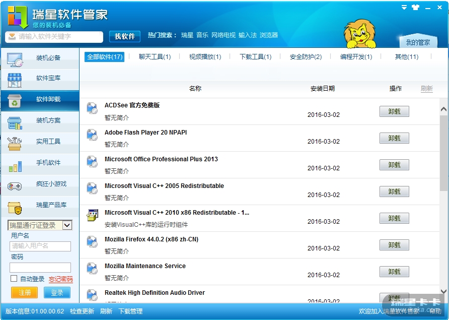 瑞星软件管家暂没有更新软件的功能,建议已反馈。