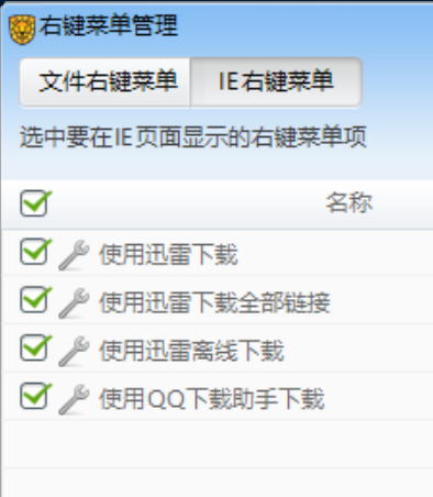 右键菜单中,文件右键菜单中“瑞星文件粉碎”、“pintostartscreen”、“使用暴风影音播放”不显示,没有链接(我的电脑安装了暴风影音)。IE右键菜单中“使用迅雷下载”、“使用迅雷下载全部链接”、“使用迅雷离线下载”、“使用QQ下载助手下载”都不能显示,没有链接(我的电脑安装了迅雷和QQ)