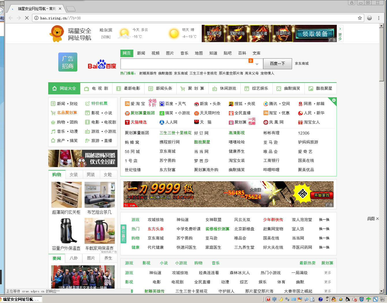 早晨打开电脑,谷歌浏览器原来设置好了的一组常用网页变成了这个,原来的那组网页说啥也打不开了!不知道瑞星这样做,是不是令人十分讨厌!即使你要宣传自己,打一下自己的广告,也没有必要让人家自己设置好的了东西不能用吧!希望瑞星不要不学好,学当流氓软件!