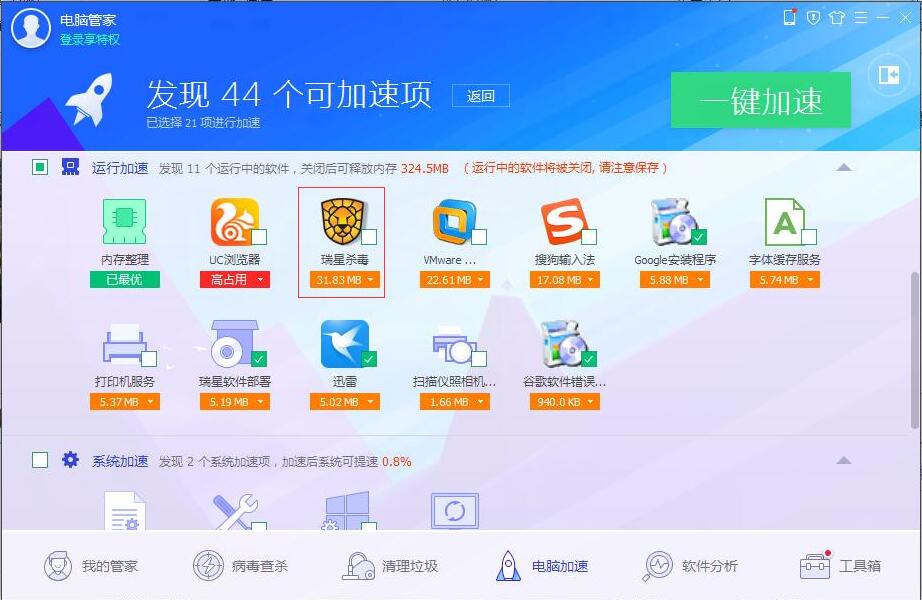 1、使用管家进行电脑加速 , 然后勾选瑞星进程 ,