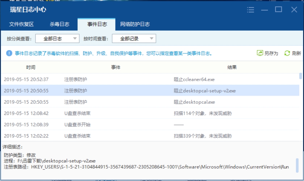 还是不行,试了试发现还不止是注册表的事,只要打开DesktopCal就会重启几次桌面,但V17没有阻止的日志。开机时若DesktopCal自启,在右下角出现绿伞前DesktopCal出现,然后桌面就重启两三次。