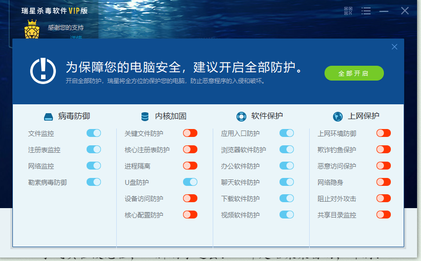 瑞星杀毒软件全部防护为什么开启不了,手动开启也没有用