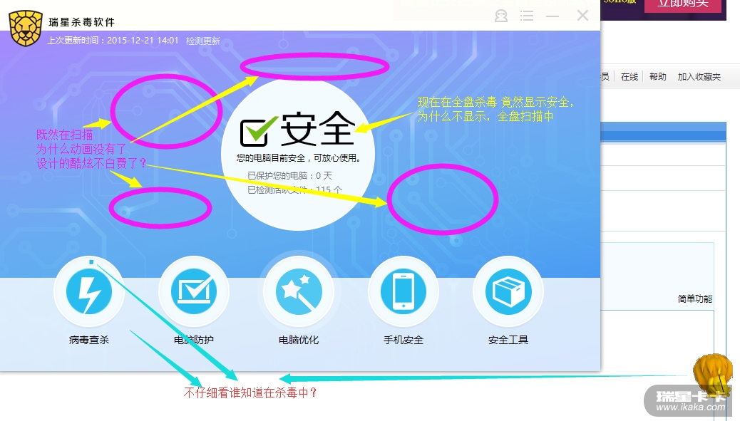 杀毒的时候主界面显示不明显 中间大的显示 尽然还是初次体验的安全 周边电路板设计 竟然没有了动画 不仔细看工作的小狮子以为没有杀毒
