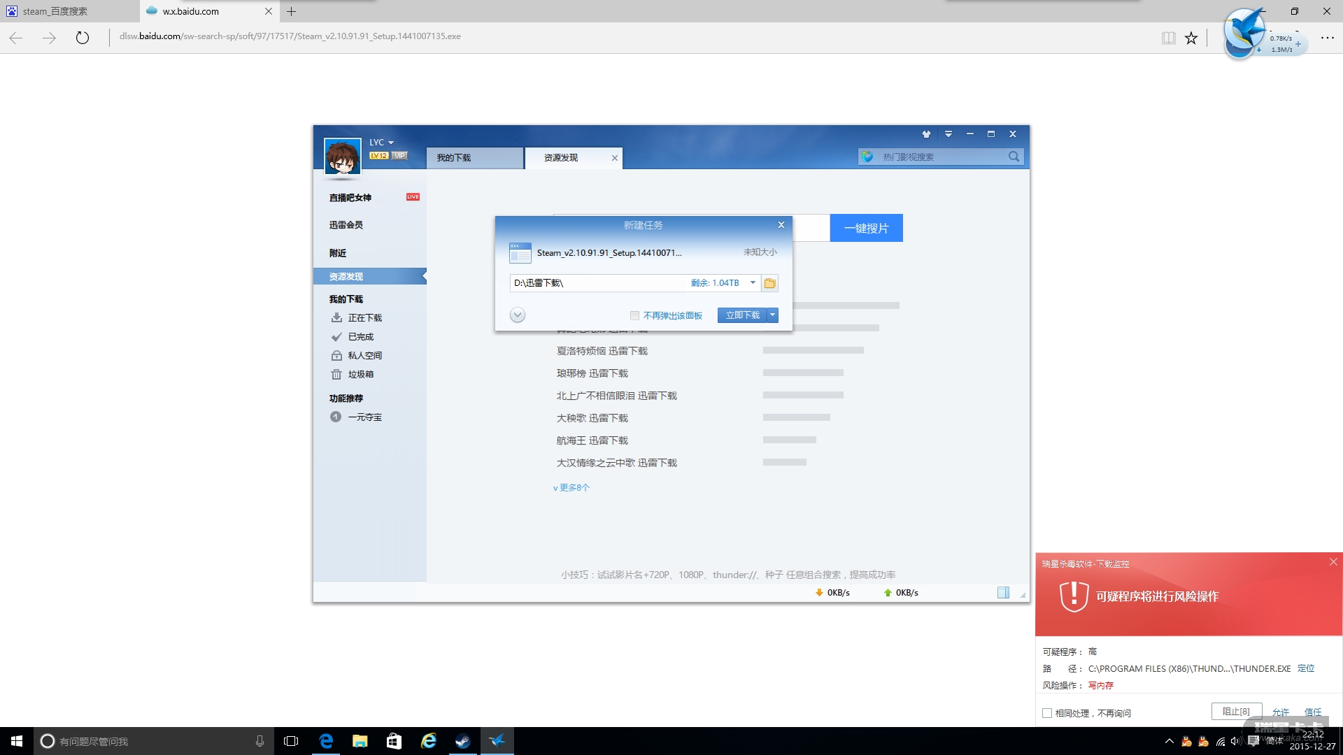 问题:用Microsoft Edge浏览器下载文件,迅雷自动开启(文件还没有开始下载)时瑞星下载监控报警。