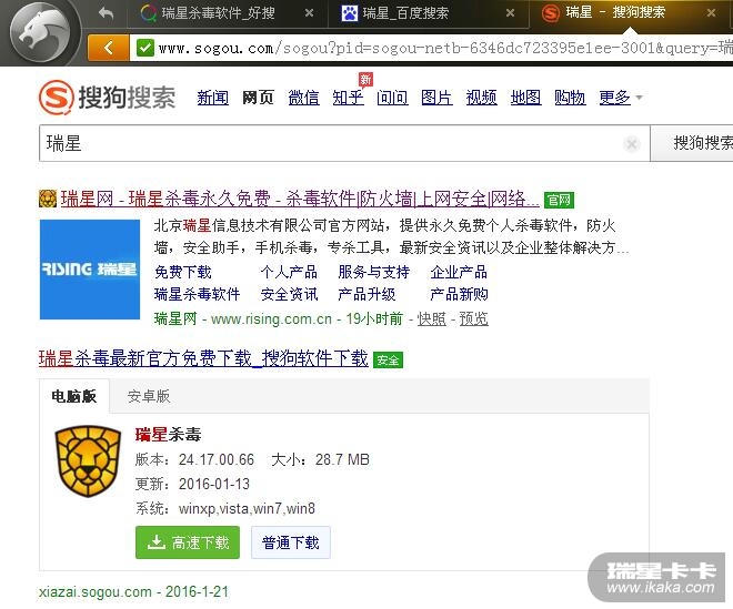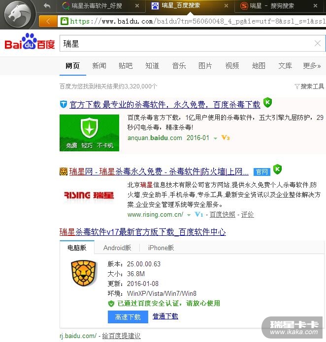 用中国的三大常用的搜索引擎搜索“瑞星”这个词语。