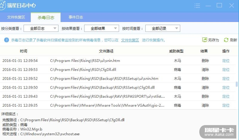 3、文件监控总是反复清除,但是 ie 和svchost进程写方式打开瑞星文件 并触发自我保护,而文件监控一直提示清除病毒成功,但是 一直杀不完,