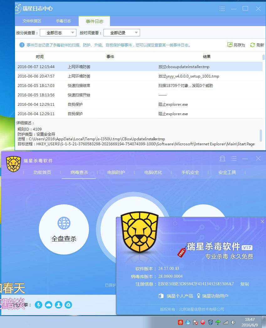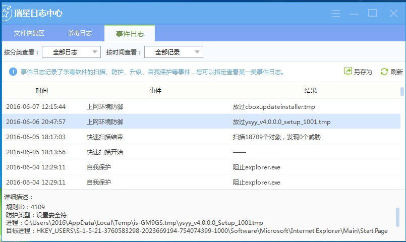 楼主之前是做过什么操作后发现瑞星日志有记录的?