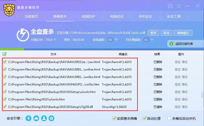 4、处理失败 ,瑞星的清除能力还是太弱,希望加强清除能力,建议添加强制删除和重启删除功能,在病毒清理失败时