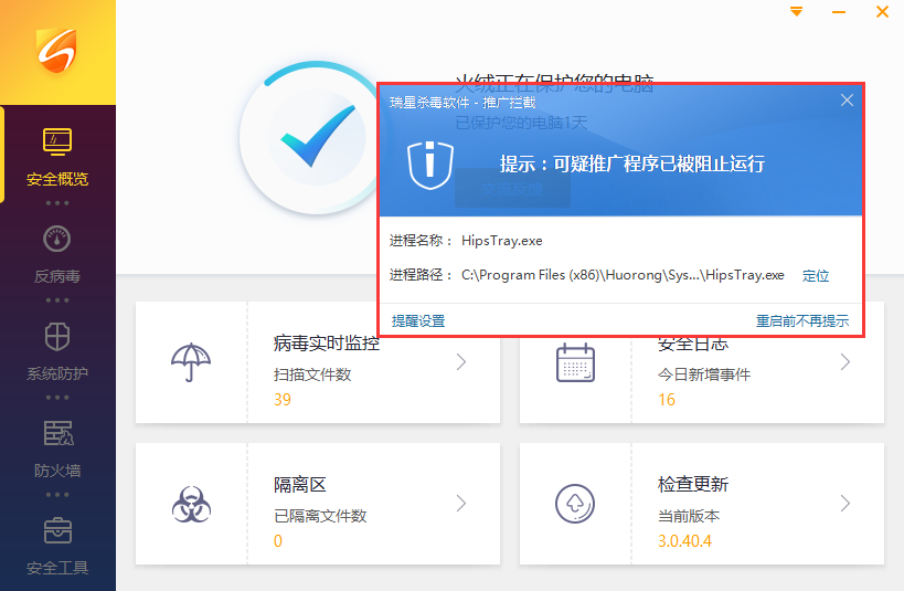1、瑞星总是 提示 推广拦截!!!  这个不用管它 ,我不是要求 联盟版兼容 火绒 !!!