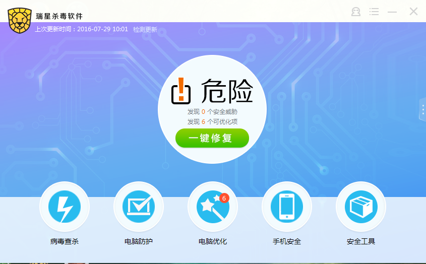 如图“RSMain.png”,初次安装瑞星杀毒软件V17,可以看到上次更新时间:2016-07-29 10:01,也就是说刚刚更新的。