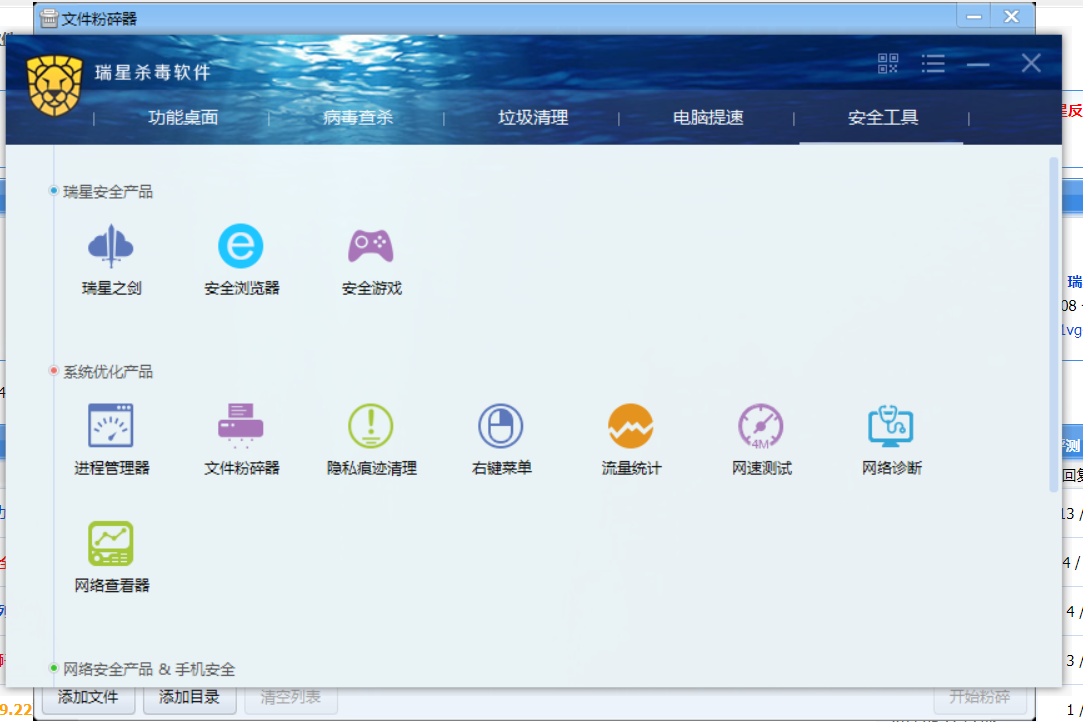 在安全工具界面点击任意小工具,打开后均在主界面的后面