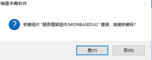 请点“是”继续安装,安装完成后瑞星软件功能不受影响。有时修复的时候服务退不掉,就会报这个错。