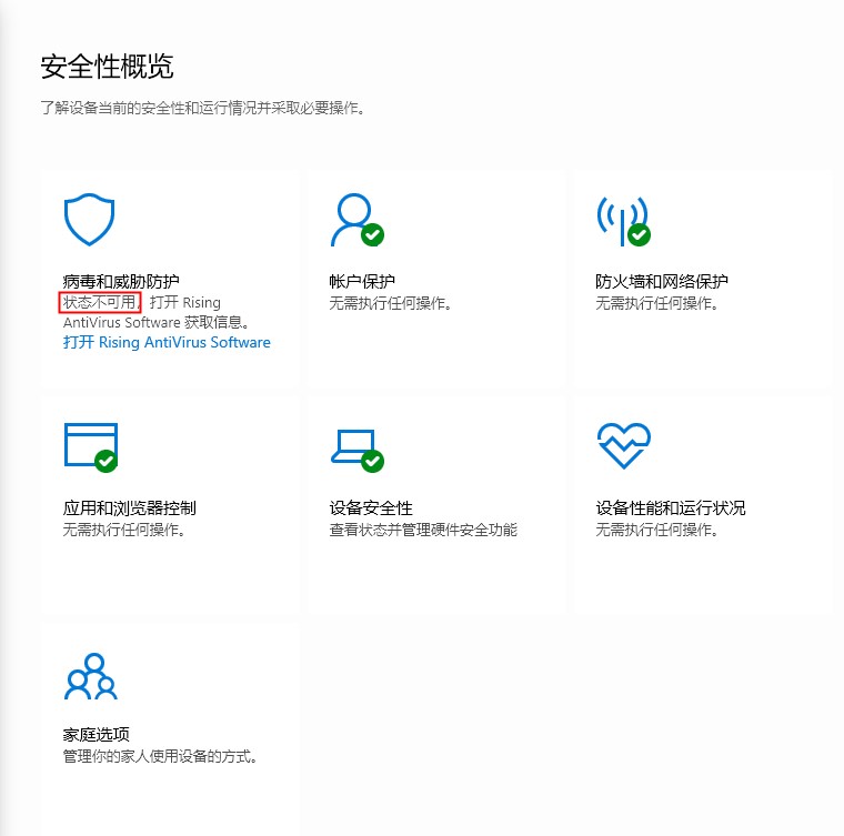 瑞星安全云终端安全防护全部开启,并且是授权用户。但是安全中心病毒防护一直提示状态不可用。win10版本一直保持版本更新,此问题持续了很久一直存在。多次反复安装仍然存在问题。