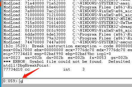 5)然后正常进行查杀,出现崩溃后 在windbg输入框中输入