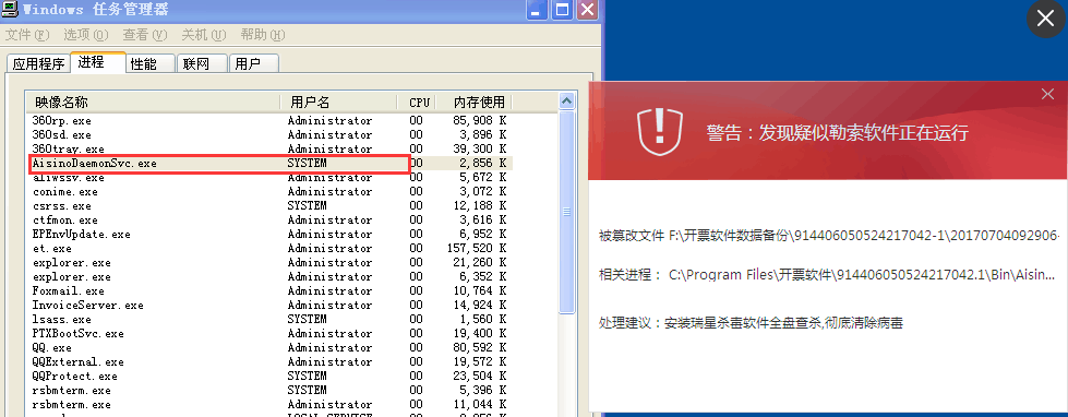 税局发票软件被认为勒索病毒, 用户一旦作出备份数据的操作,就会被瑞星之剑删除备份数据并杀死发票软件的进程。 另外,搜狗输入法也会被认为勒索病毒