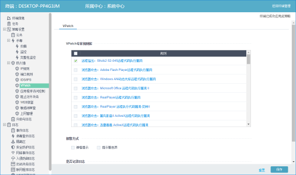 瑞星虚拟化用户可登陆瑞星虚拟化系统统管平台,选择需要开启防护的客户端,打开防火墙VPatch功能,并勾选Struts2 S2-045远程代码执行漏洞的防御规则,即可开启漏洞防御保护。