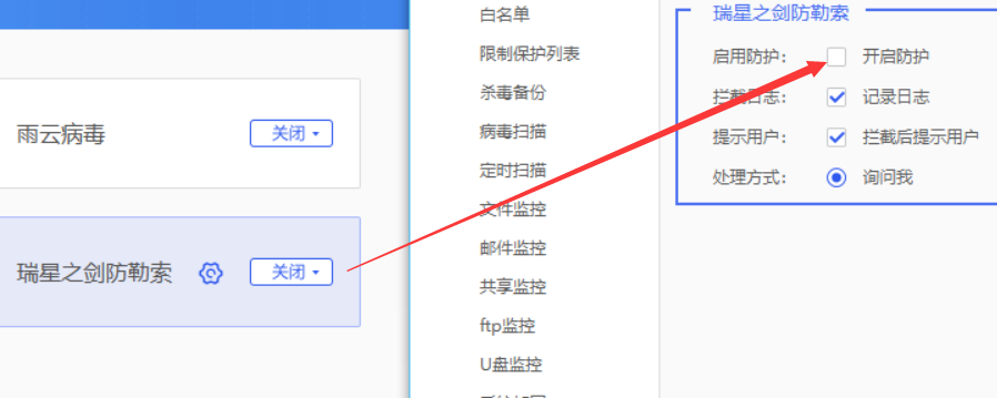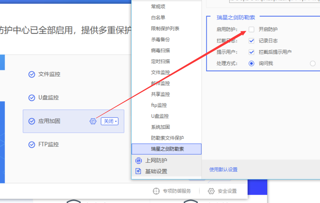 1.系统防护》应用加固的状态显示已开启,点击齿轮图标定位到设置中心的瑞星之剑,但是开启防护前面的选相框未勾选,那到底是开启没开启?