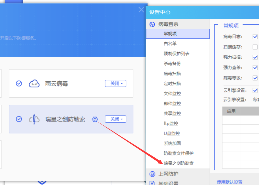 2.再看专项防御力里面怎么又有瑞星之剑,和1那里的应用加固是同一个东西?而且点设置齿轮后设置中心定位错误,应该定位到箭头指向处,现在定位到常规项了。