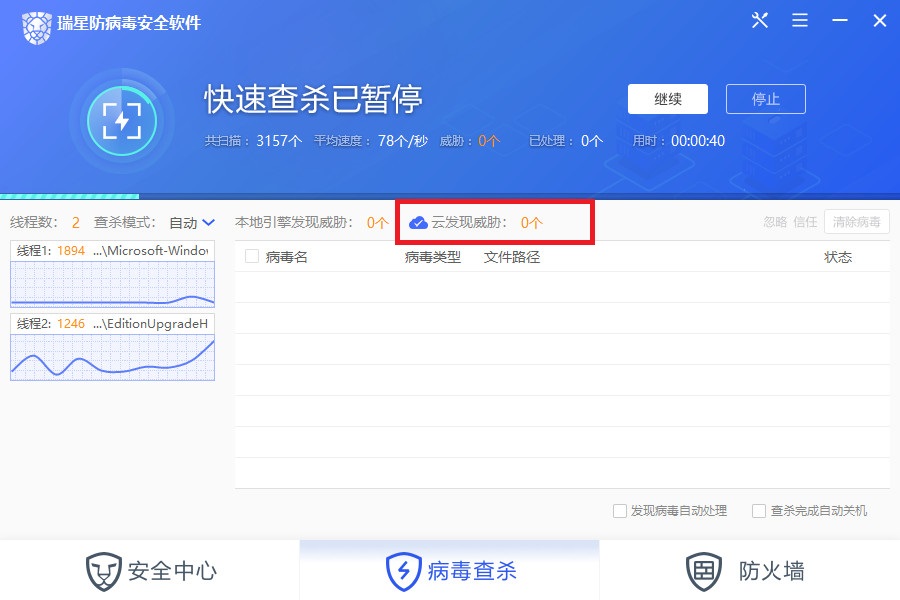 瑞星查杀使用本地引擎和云引擎双模形式,但是在断网或瑞星未联网状态,云引擎是未启动的。但是瑞星软件并没有任何提示,建议瑞星对主界面进行修改。
